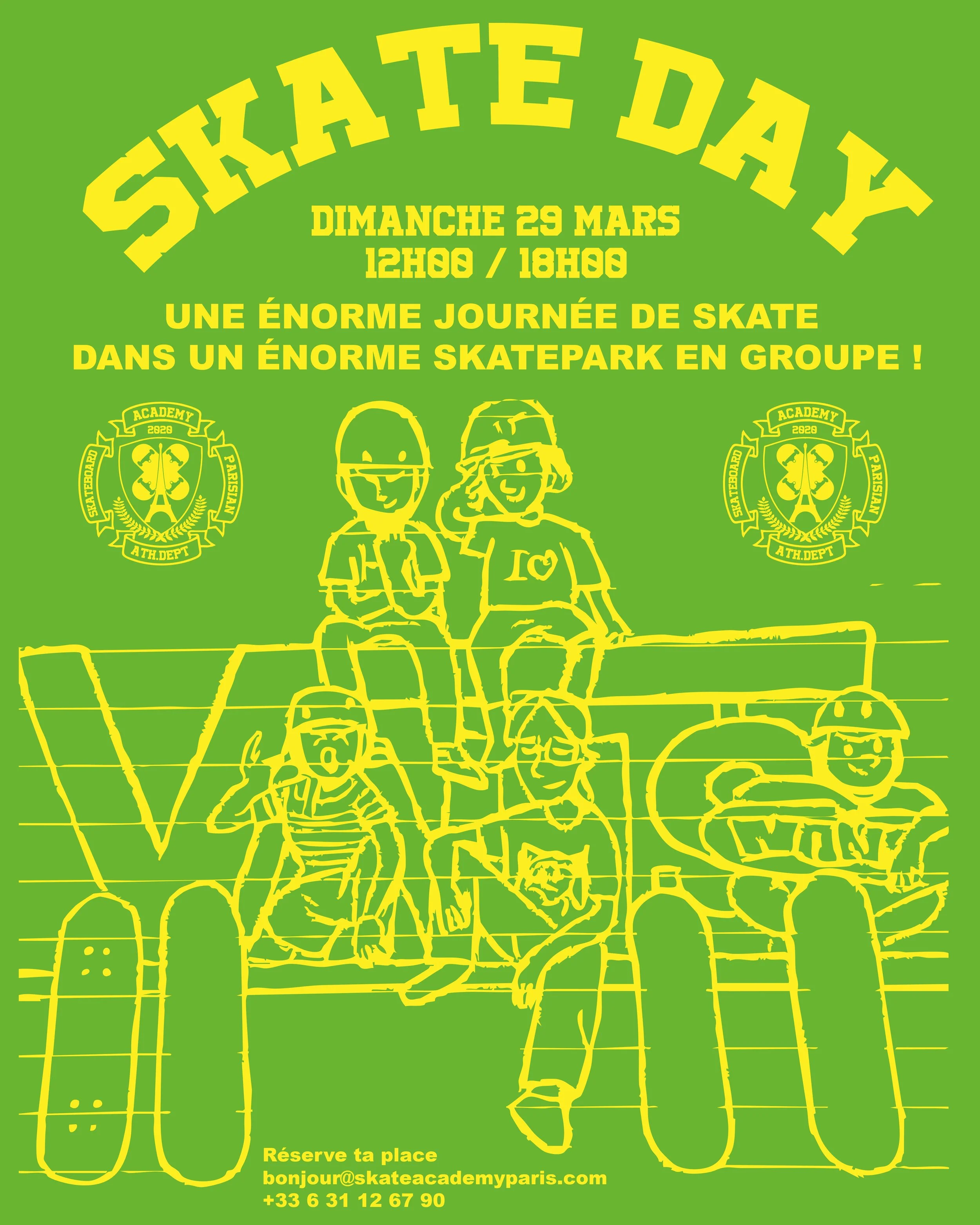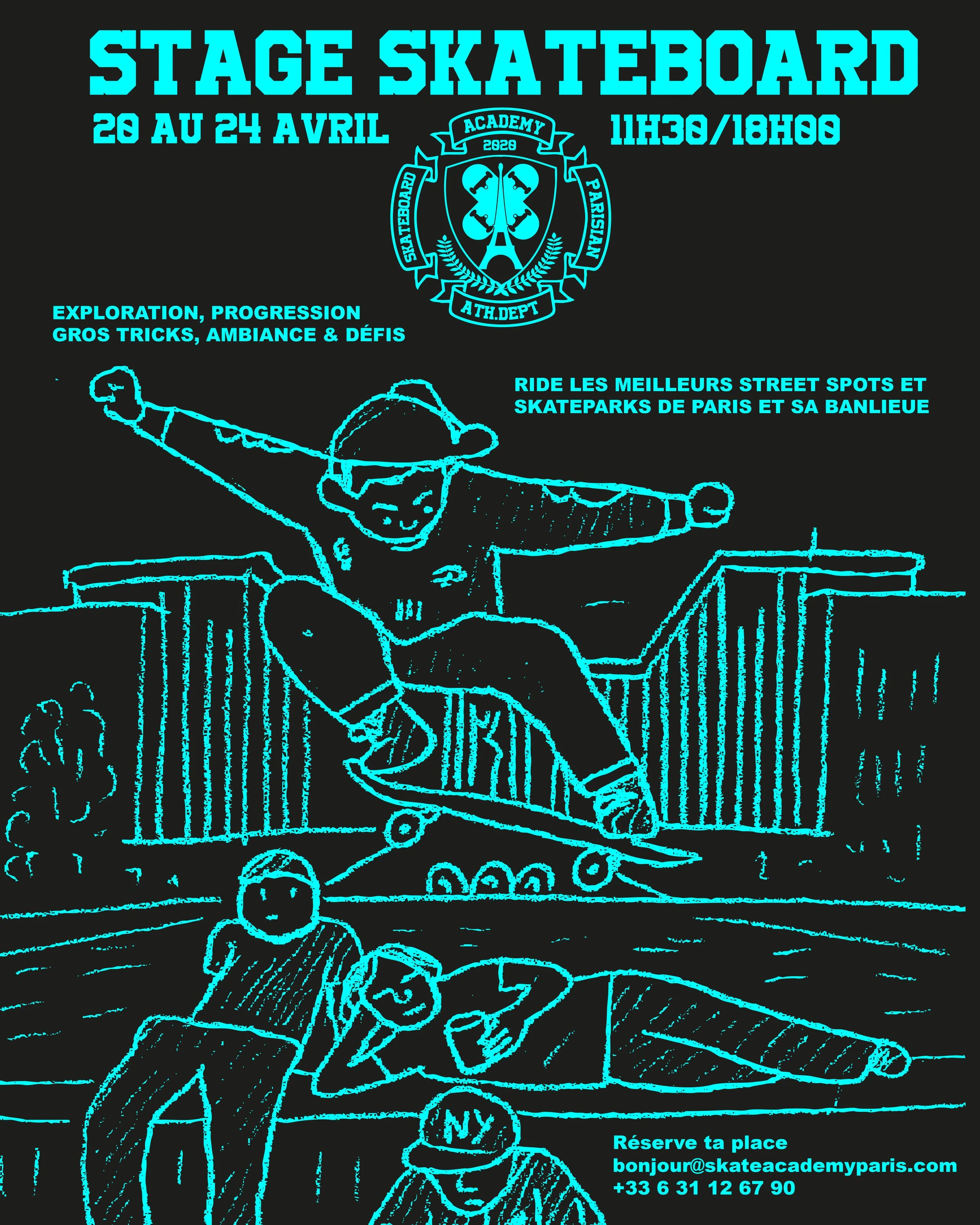Pendant les vacances scolaires, on organise les meilleurs stages de skate ! 🚀 Une semaine de pur skate en groupe - du lundi au vendredi, de 11h30 à 18h. Chaque jour, on découvre 2 spots différents dans Paris et sa banlieue. C’est l’occasion parfaite pour progresser à fond, partager de bons moments avec les autres riders et vivre une vraie immersion de skateboarder. On organise aussi des Skate Days, qui fonctionnent sur le même principe mais se déroulent sur une seule journée pendant les périodes scolaires. Attention, il y en a moins d’une dizaine par an ! 🛹🔥